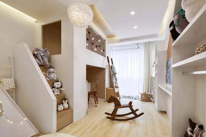 因为考虑到上小学的大宝需要有足够的学习空间,两个双胞胎也需要玩耍空间,改造后的儿童房可以说是满足了多种需求。
