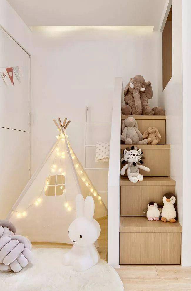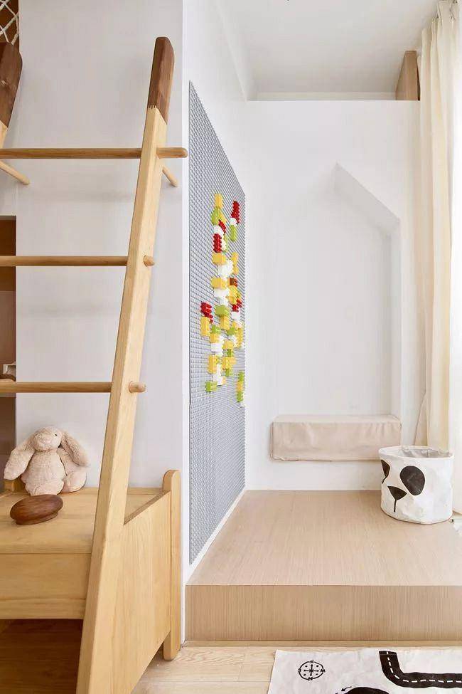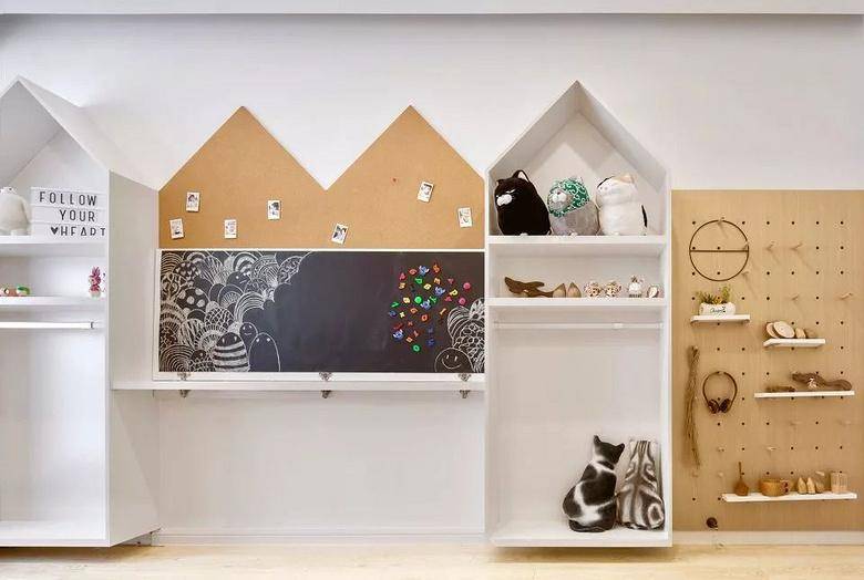 其他墙面的设计非常童趣,洞口板可以方便日常收纳,小黑板可以各种涂鸦,小房子造型的收纳架非常可爱。