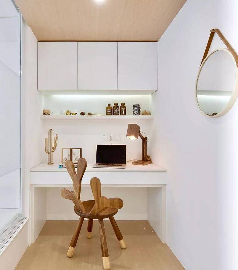 旁边的榻榻米,设计师还专门设计了一个独立的办公空间。不但方便爸爸偶尔去办公室,还可以做妈妈的衣橱。