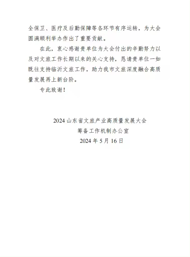 2024年山东文旅产业高质量发展大会于4月25-26日在临沂成功举办。作为本次活动的重要通信保障单位,临沂联通有效组织、周密安排、统筹推进通信保障、网络安全等各项工作,圆满完成大会多场馆通信保障工作,收到2024山东文旅产业高质量发展大会感谢信。
