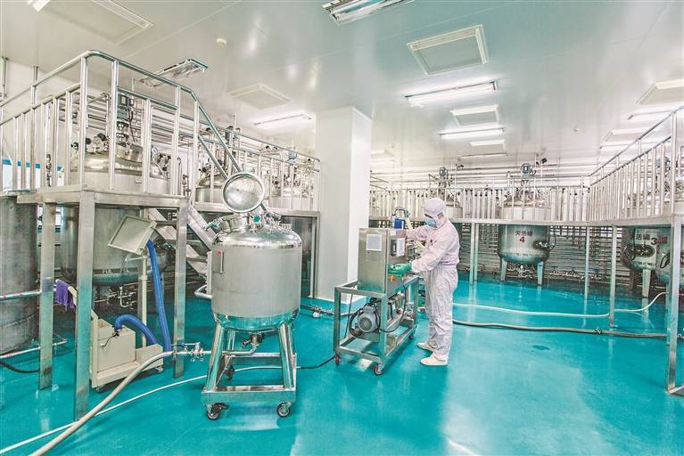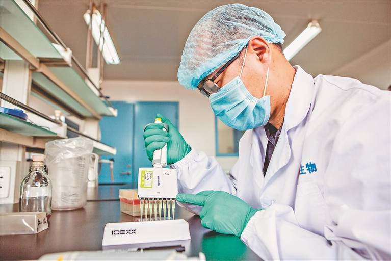 站在厂区右侧的一排产业化车间前,公司总裁曾显营如数家珍地向记者介绍,“这里共建有DNA疫苗、细胞悬浮培养高致病性禽流感病毒灭活疫苗、胚培养高致病性禽流感病毒灭活疫苗、布氏菌病活疫苗等21条生产线,全部通过新版兽药GMP验收。其中,非洲猪瘟活疫苗生产线为全球第一条。同时,还建有国家禽流感疫苗抗原储备库、质量检验、研发、动物实验等配套设施。”