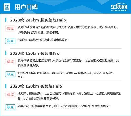 在用户口碑中,多数消费者对2023款领克08新能源的内饰、多媒体系统以及动力表示满意。不过,也有车主表示该车存在冬季实际纯电续航低、行驶时噪音较大以及HUD平视显示系统影像模糊等情况,令车主比较烦恼。