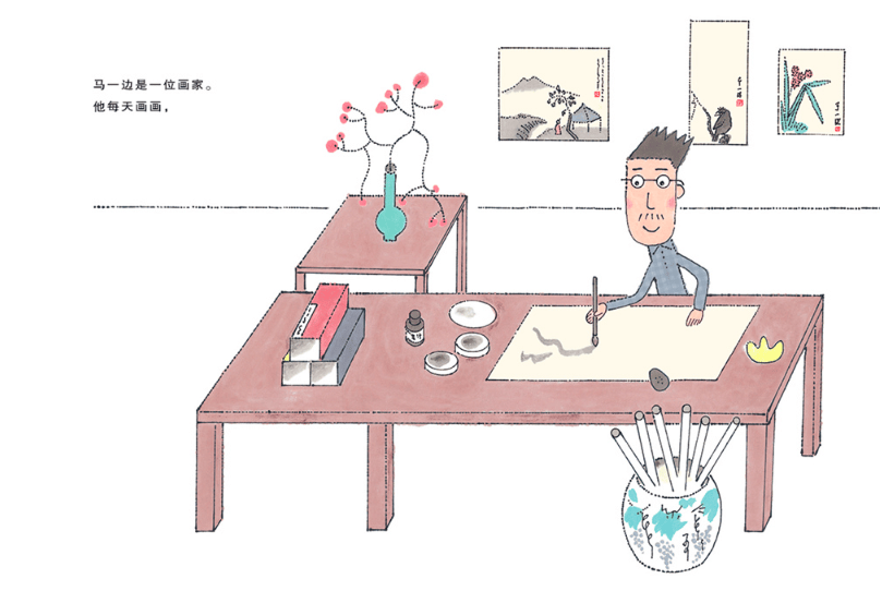 这是一本与中国传统水墨画的创作意蕴相结合的故事绘本,越来越喜欢丰富、热闹的我们似乎忘记了“留白”的美与意境。马一边是一位画家,他每天一边画画,一遍照顾他养的一头牛、一只鸟和一条金鱼,过着简单、规律的生活。他总是睡在靠近太阳的一边,在人少的一边散步,他的牛都喜欢只吃一边的草。他的好朋友夏冬心住在山的另一边,夏冬心的生日快到了,马一边想画一幅画给他做礼物,可是,画什么好呢?画蟋蟀?还是画虾?直到他散步到一片芭蕉林。“呼呼呼……”什么声音?寻声走去,原来是夏冬心在芭蕉树下睡午觉,马一边在旁边静静站了一会儿。有啦!他马上高高兴兴地回了家,铺开画纸,不停地画啊画啊……