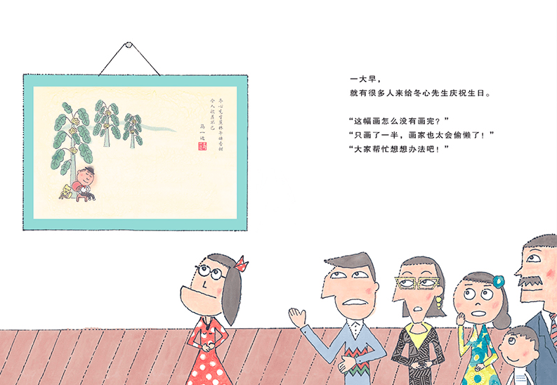 本书故事的灵感源自清代画家罗聘的水墨画《冬心先生蕉荫午睡图》,同时结合了南宋画家马远与夏圭(分别被称为“马一角”“夏半边”)的“留白”风格。在绘画技法上,尝试融合了传统水墨画和现代插画的表现形式,使画面兼具水墨风与现代感。