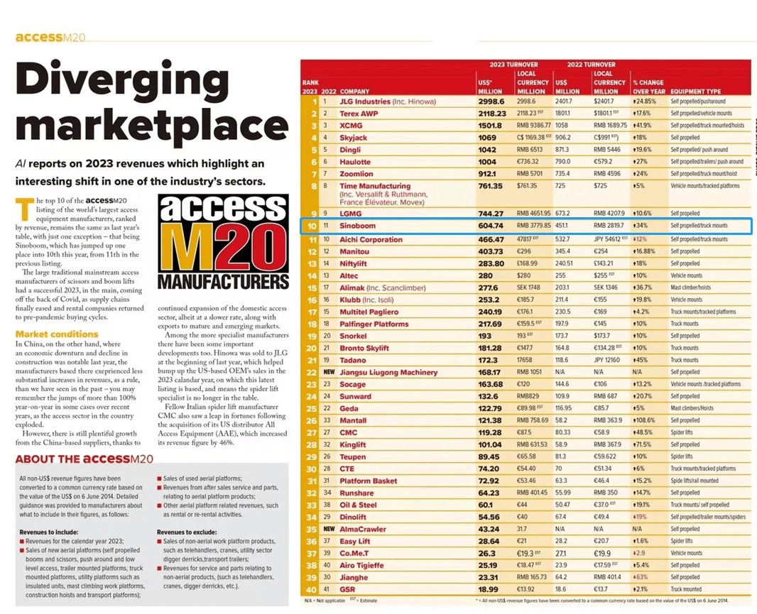 5月23日,英国KHL集团旗下《Access International》杂志发布“2023年全球高空作业机械企业20强”榜单(Access M20),星邦智能凭借近年来优异的市场表现和高质量发展再次进入全球第十强。