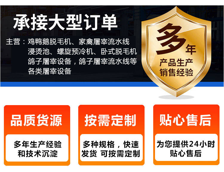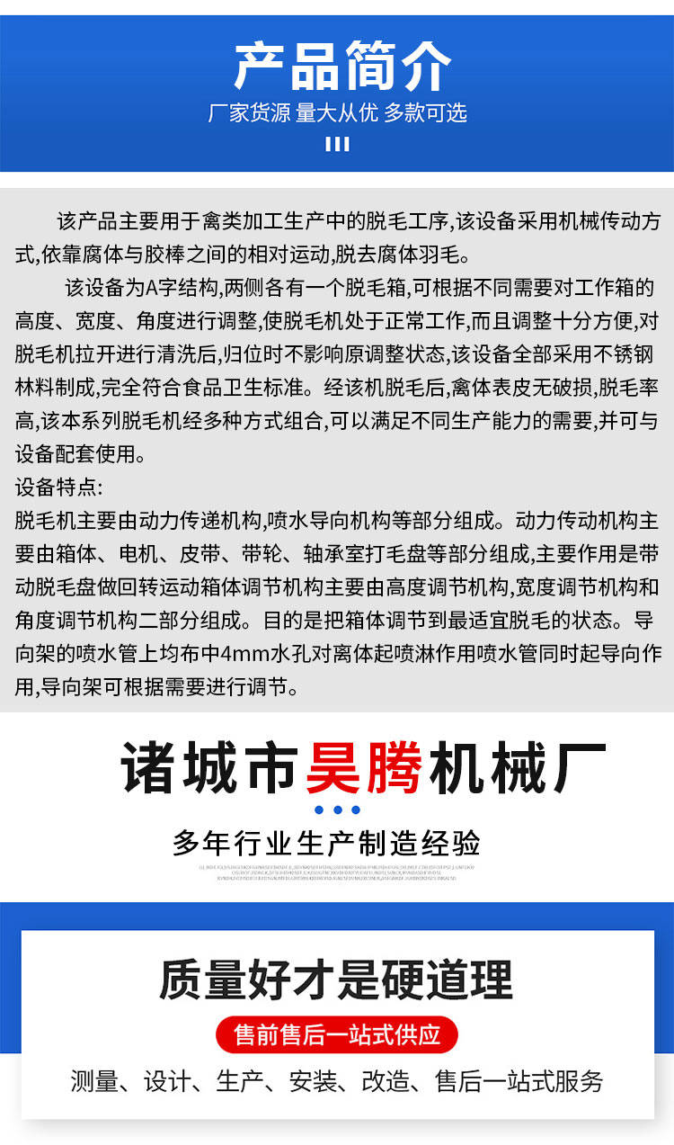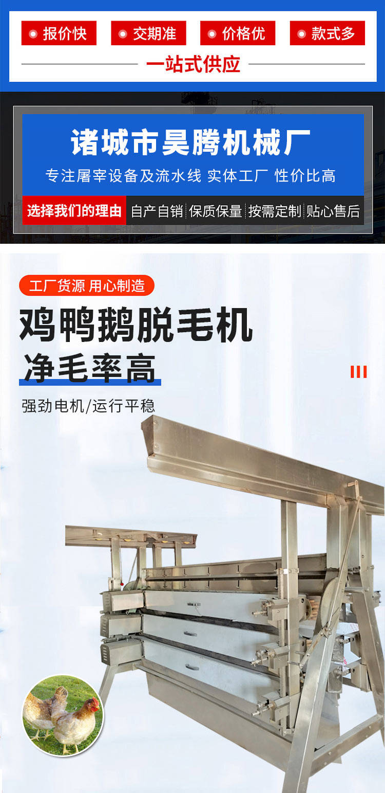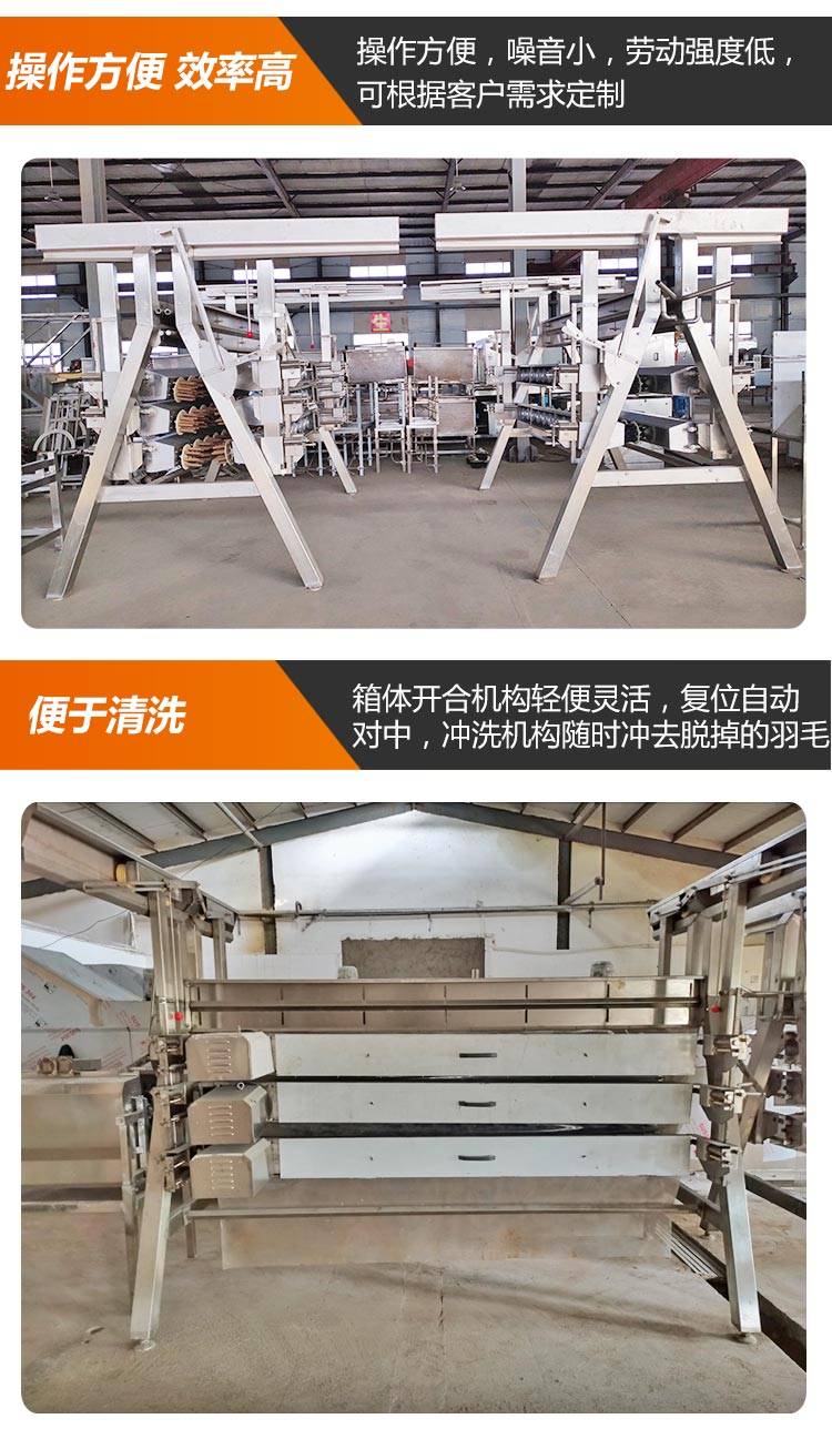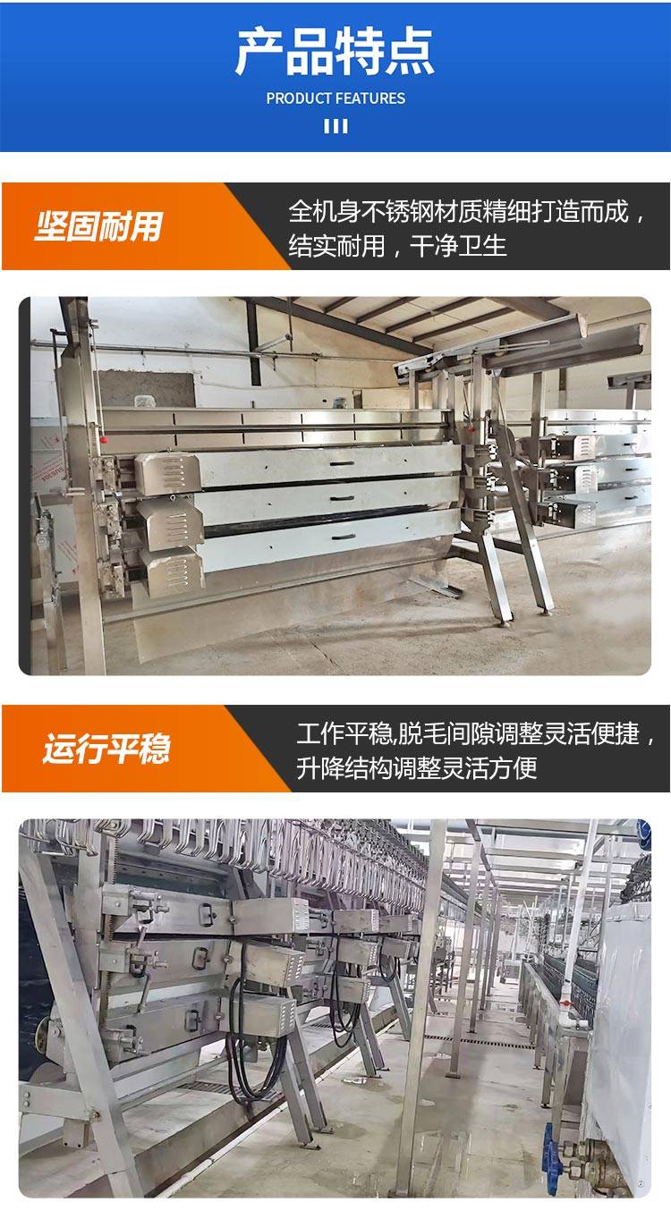 公鸡屠宰脱毛机整机总长为四米五,总重量大概在两千三百公斤左右,是一款大中型家禽屠宰厂家用的一款脱毛设备,此款脱毛机市场应用比较广泛,是一款既可以单机使用又可以配合我们厂家所生产的家禽屠宰流水线一起使用的一款家禽脱毛机,因为此款脱毛机操作简单,任何人都能简单的操作,此款设备一经面市就得到了广大用户的一直厚爱,并且得到了广大用户的一直好评反馈。