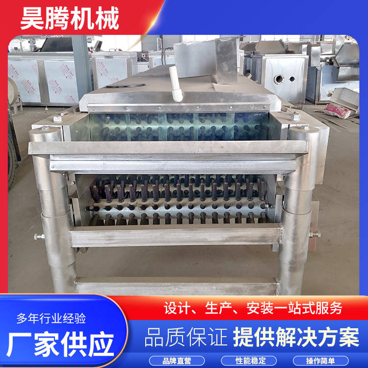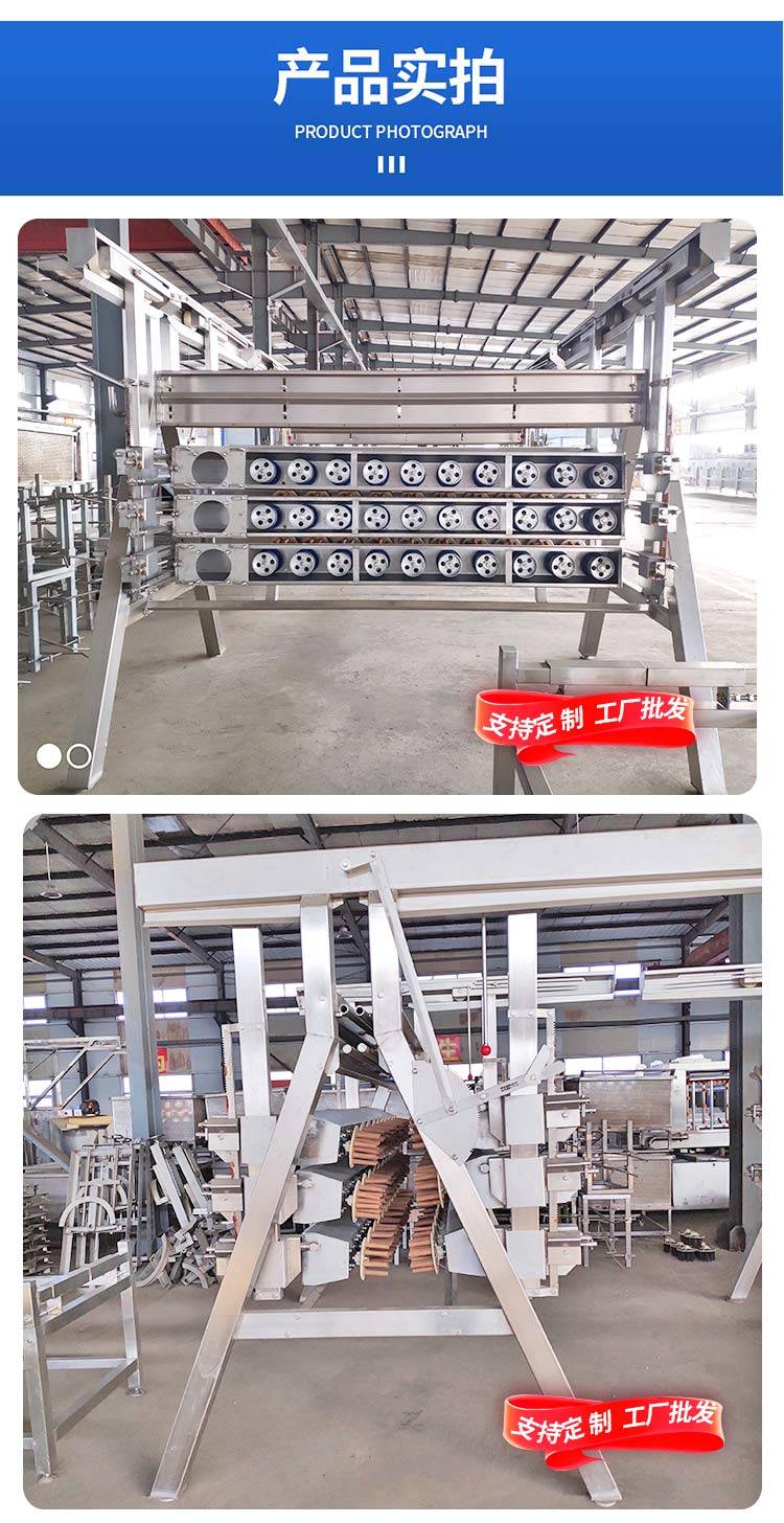 公鸡屠宰脱毛机为卧式转辊结构,采用链条传动,使上下两排脱毛辊实现相对转动,从而脱去羽毛.上下两排脱毛辊的间距可以调整,以适应不同鸡大小的需要.