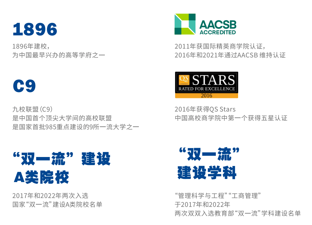 西安交通大学管理学院始建于1928年,是我国最早的管理学院之一,是国家第一批工商管理硕士(MBA)和高级管理人员工商管理硕士(EMBA)试点学院之一,AACSB国际精英商学院认证高校和QS Stars世界一流五星级商学院认证高校。从2002年开始,在教育部学科评估中始终名列前茅。2017年和2022年,工商管理、管理科学与工程连续两次双双入选国家“双一流”学科建设名单。