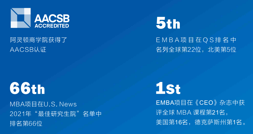 阿灵顿商学院获得了AACSB认证,其EMBA项目在QS排名中名列全球第22位,北美第5位。MBA项目在U.S.News 2021年“最佳研究生院”名单中排名第66位。EMBA项目在《CEO》杂志中获评全球MBA课程第21名,美国第16名,德克萨斯州第1名。