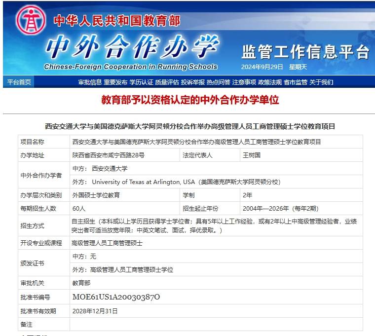 2004年,西安交通大学与美国德克萨斯大学阿灵顿分校合作举办高级管理人员工商管理硕士(EMBA)学位教育项目获得国家教育部批准。