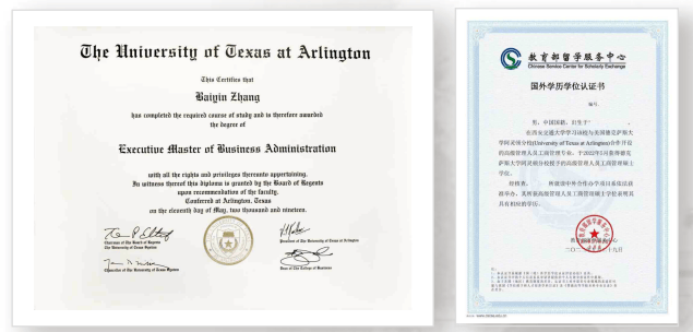 本项目学制两年,毕业生可获得美国德克萨斯大学阿灵顿分校颁授的EMBA学位证书,该证书可以在国家教育部留学服务中心进行学历学位认证。