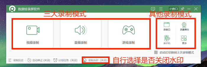 步骤2:打开软件后,你可以自由选择录制的模式,按照需求选择就可以了。本篇文章以“视频录制”模式为例。