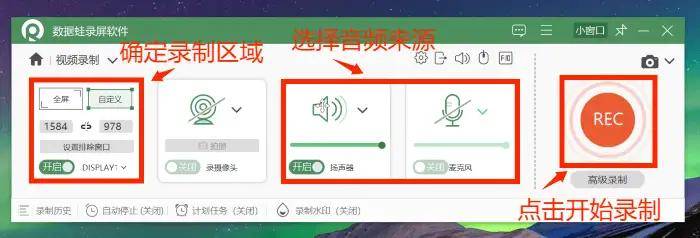 步骤3:确定好录制区域(全屏或部分屏幕)、声音来源(电脑音频或外部麦克风)、视频格式、画质等参数。然后点击“REC”按钮开始录制。