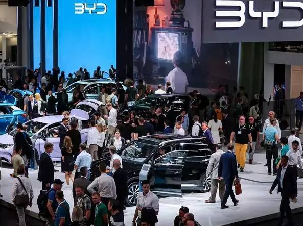 2023年9月6日,在德国慕尼黑举行的IAA Mobility 2023国际汽车展上,参会者参观中国汽车品牌比亚迪的电动汽车。法新社