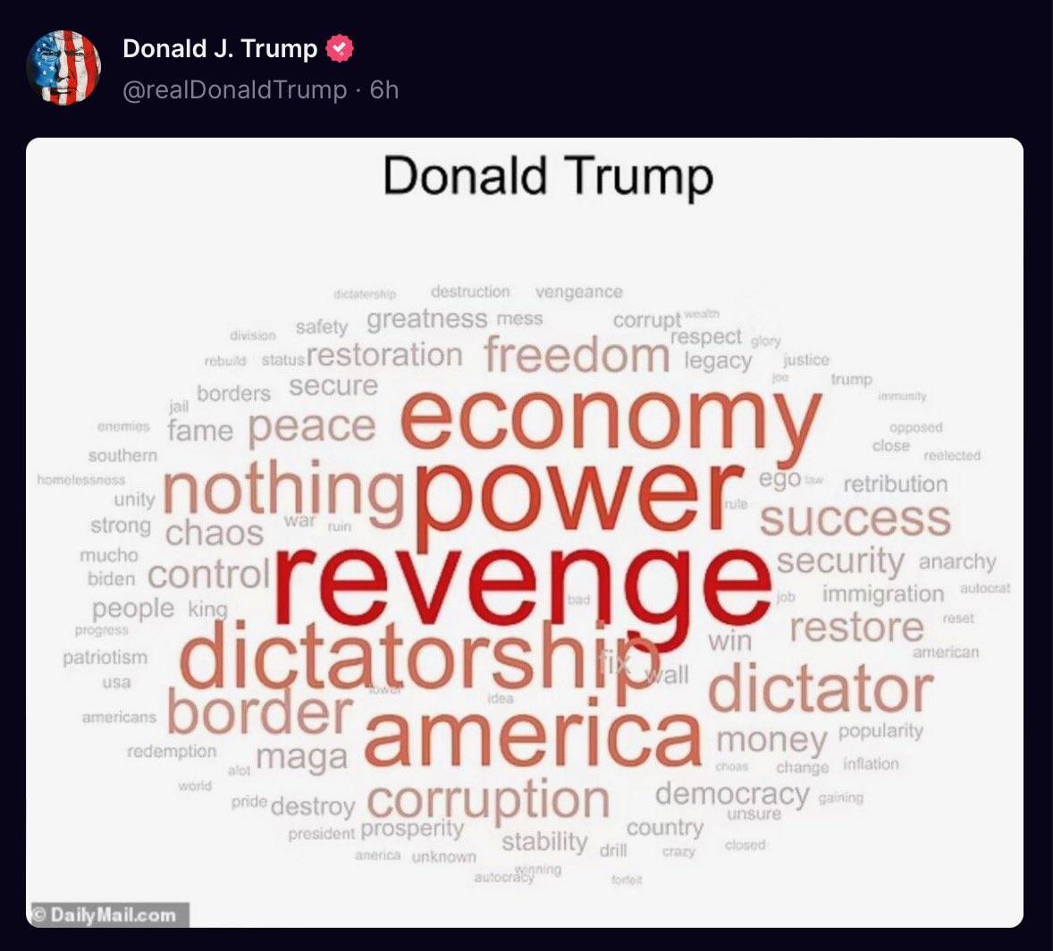 去年12月,特朗普在其旗下社交媒体平台“真实社交”转发了一项关于民众如何看待他第二个总统任期的民调结果。中间最醒目的红色大字写着选民提到最多的词:“复仇”。