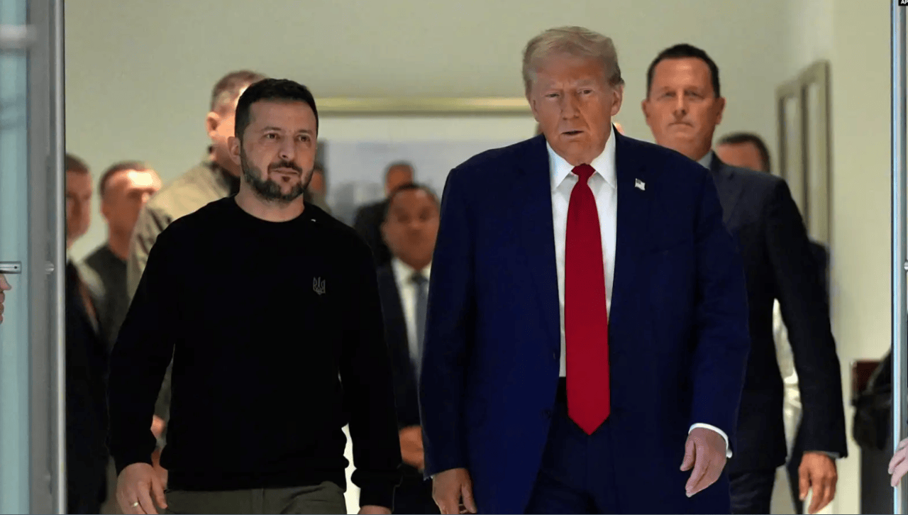 共和党总统候选人、前总统特朗普2024年9月27日在纽约特朗普大厦会晤乌克兰总统泽连斯基。(图源:美联社)
