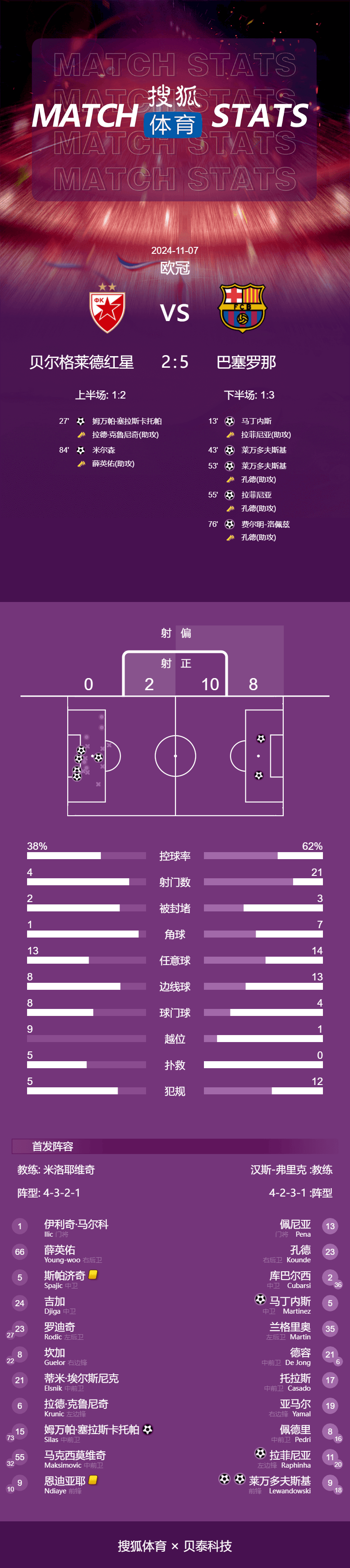 第26分钟,主队扳平比分!红星前场右侧多脚短传配合,随后姆武帕接队友斜塞后杀入禁区右侧,面对门将挑射得手,1-1!第34分钟,红星前场接队友直塞后策动反击,但越位过于明显,裁判直接吹罚了进攻机会无效,值得一提的是,这也是巴萨连续第7场造越位成功。第43分钟,拉菲尼亚弧顶中路接佩德里分球,随后爆射打门击中立柱,莱万机敏前插补射得手,2-1!