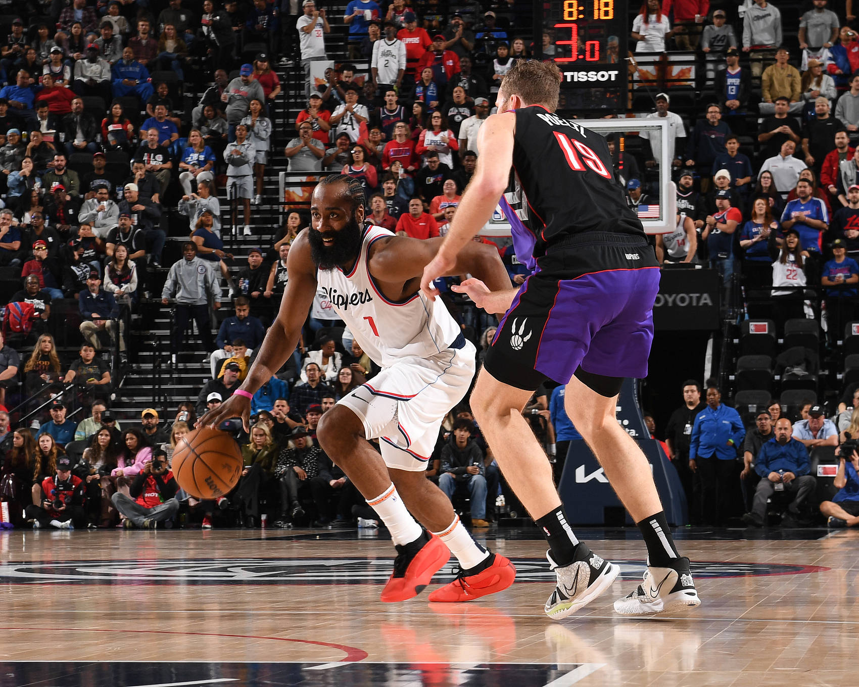 末节比赛还剩28秒,哈登保护下防守篮板并造成了对手的犯规,他2罚1中帮助快船获得2分的领先优势,猛龙再次错失进攻机会,无奈的犯规再次送个了快船罚球机会,鲍威尔2罚1中,快船105-102领先猛龙3分。