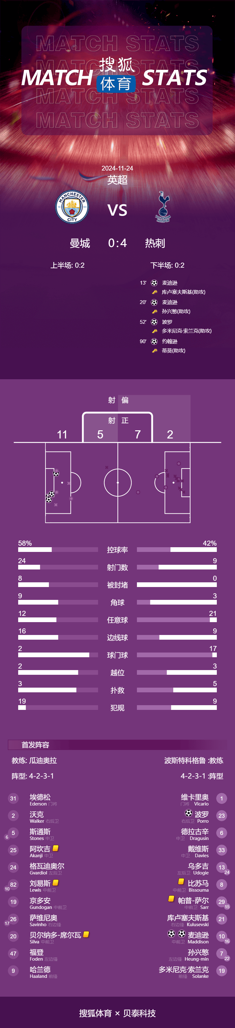 热刺(4-3-3):1-维卡里奥/13-乌多基(90分钟,20-斯彭斯)、33-本-戴维斯、6-德拉古辛、23-波罗/8-比苏马、29-帕普-萨尔(90分钟,15-贝里瓦尔)、10-麦迪逊(89分钟,16-维尔纳)/21-库卢塞夫斯基、7-孙兴慜(63分钟,22-布伦南-约翰逊)、19-索兰克