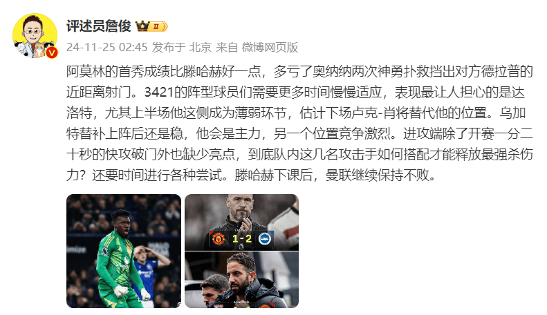 知名体育评论员詹俊赛后在个人社媒发文点评:阿莫林的首秀成绩比滕哈赫好一点,多亏了奥纳纳两次神勇扑救挡出对方德拉普的近距离射门。3421的阵型球员们需要更多时间慢慢适应,表现最让人担心的是达洛特,尤其上半场他这侧成为薄弱环节,估计下场卢克-肖将替代他的位置。乌加特替补上阵后还是稳,他会是主力,另一个位置竞争激烈。进攻端除了开赛一分二十秒的快攻破门外也缺少亮点,到底队内这几名攻击手如何搭配才能释放最强杀伤力?还要时间进行各种尝试。滕哈赫下课后,曼联继续保持不败。