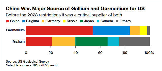 中国是美国镓和锗等关键矿物的主要来源国彭博社制图