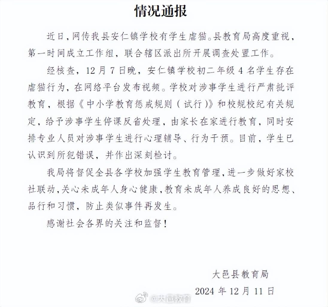 经核查,12月7日晚,安仁镇学校初二年级4名学生存在虐猫行为,在网络平台发布视频。学校对涉事学生进行严肃批评教育,根据《中小学教育惩戒规则(试行)》和校规校纪有关规定,给予涉事学生停课反省处理,由家长在家进行教育,同时安排专业人员对涉事学生进行心理辅导、行为干预。目前,学生已认识到所犯错误,并作出深刻检讨。