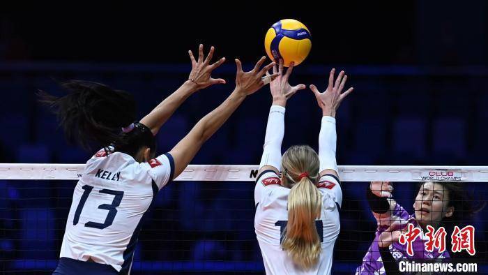 图为天津渤海银行女排(紫)与巴西米纳斯女排(白)比赛现场。(2024年世界女子排球俱乐部锦标赛组委会供图)