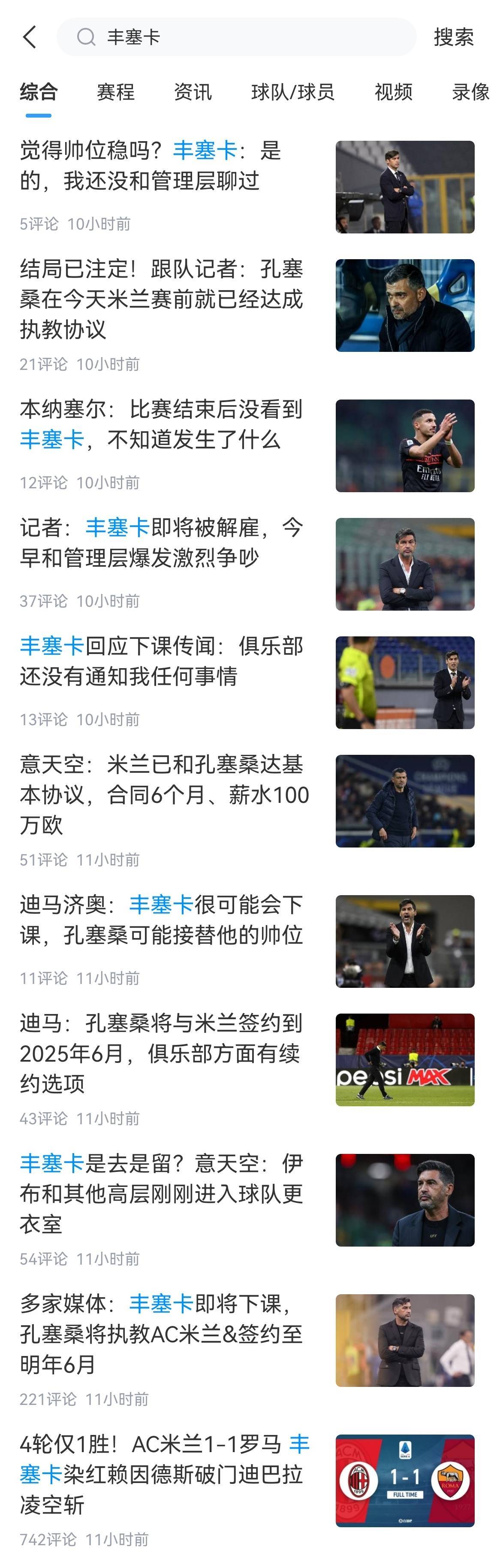 AC米兰战平罗马赛后,多家意媒表示,AC米兰决定换帅,丰塞卡下课,孔塞桑接任。但率先接受采访的丰塞卡表示自己并不知情。