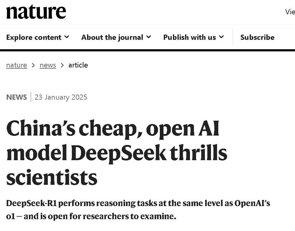 英国知名学术期刊《自然》就在其网站上刊登的一篇文章中介绍说,DeepSeek R1让全世界的科学家感到激动。首先是因为这个在中国杭州开发出来的模型,在第三方的科研人员的测试中成绩斐然——尤其是在化学、数学和写代码方面的表现已经追上了目前美国最强的人工智能公司OpenAI相当先进的o1模型。