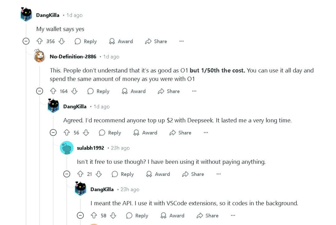 这样的观点还出现在了美国的一些社交媒体和网络论坛的帖文里。比如,在美国的社交平台Reddit上,当有人询问DeepSeek R1究竟好在哪里时,点赞最多的评论都不约而同地提到了其“对钱包友好”的特质。