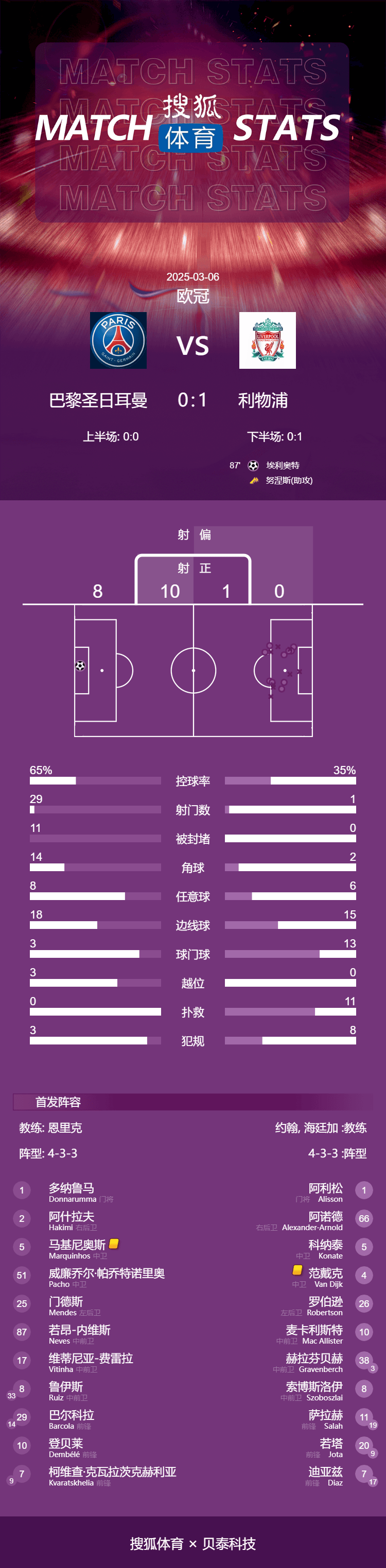 北京时间3月6日04:00,2024-25赛季欧冠1/8决赛第一回合继续进行,利物浦做客法国王子公园球场1-0战胜巴黎圣日耳曼,在两回合赛制中占据先机。全场唯一进球出现在第87分钟,替补出场的埃利奥特第一脚触球便洞穿巴黎圣日耳曼门神多纳鲁马十指关,这也是利物浦在该场比赛中唯一一次打在门框范围内的射门。巴黎圣日耳曼本场比赛的数据全面占优,一共完成27次射门,其中10次打在门框范围内,门神阿利森共计完成9次神扑,另外在队友的帮助下,利物浦实现了零封。