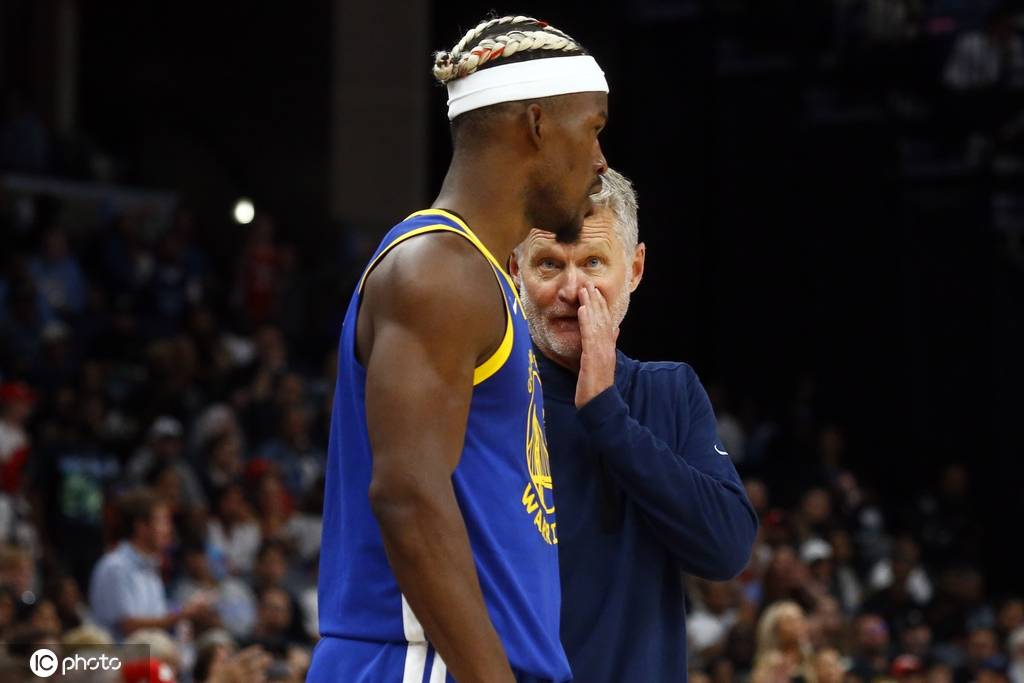 勇士队首发:斯蒂芬-库里、吉米-巴特勒、德雷蒙德-格林、摩西-穆迪、布兰丁-波杰姆斯基