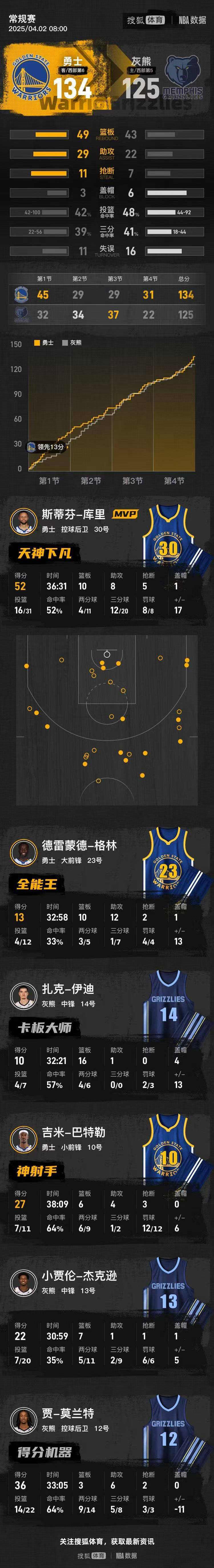 最后一节,灰熊开局迅速拉开比分,以120-116取得领先。然而,勇士反击强劲,不仅将比分追平,还一度领先灰熊达到9分。尽管灰熊在小节后段努力缩小分差,但无奈勇士的攻势依然猛烈。本节中,勇士的巴特勒表现出色,贡献10分。最终,勇士以134-125赢得比赛。