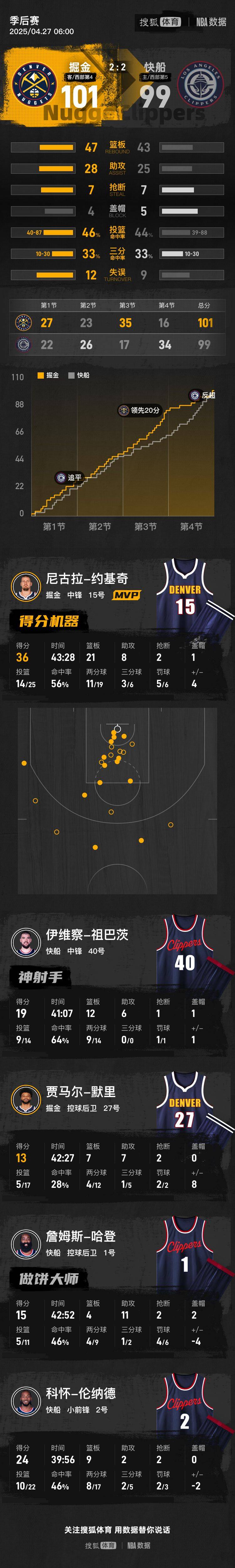 【搜狐体育战报】北京时间4月27日NBA季后赛,客场作战的掘金凭借阿隆-戈登绝杀,以101-99击败快船。双方系列赛战至2-2,将进入天王山之战。