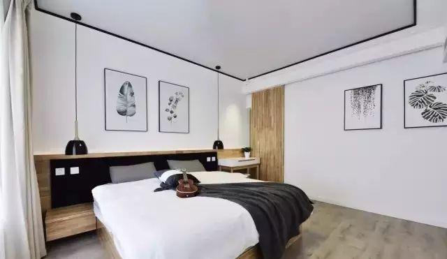 ▲主卧风格简约,黑色床头和灯光点缀,为卧室增添质感风格。
