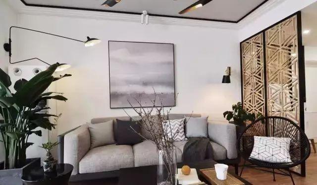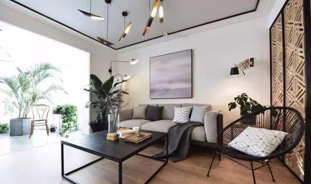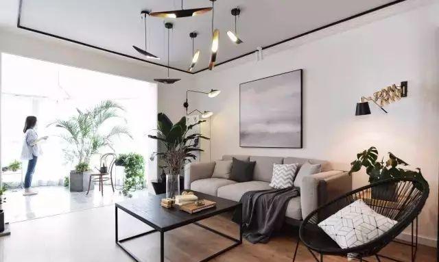▲客厅以黑色和灰色两种颜色,金色灯具和绿色植物点缀。