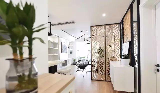 ▲站在玄关里看着室内,一道黄黑相间的屏风挡住了视线,避开视线直接进入客厅,仿佛分开,简单朦胧。