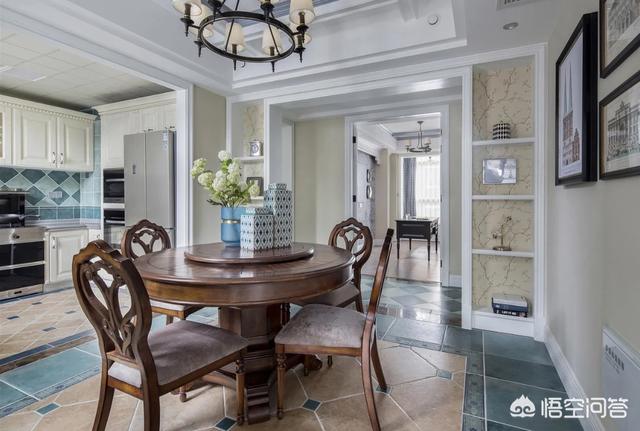 开放式厨房,餐厅垭口两侧储物格简式装修。 桌子可以旋转,吃起来更方便。