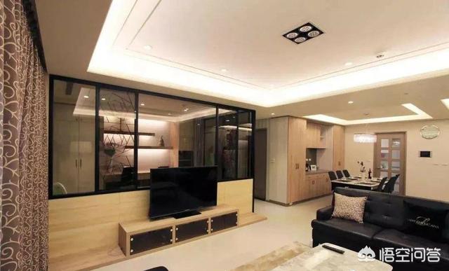 在电视墙目的做断绝,做半高的墙体,普遍90-1.2米安排,上方用室内窗,大概工艺玻璃做电视墙书斋断绝装修功效图。