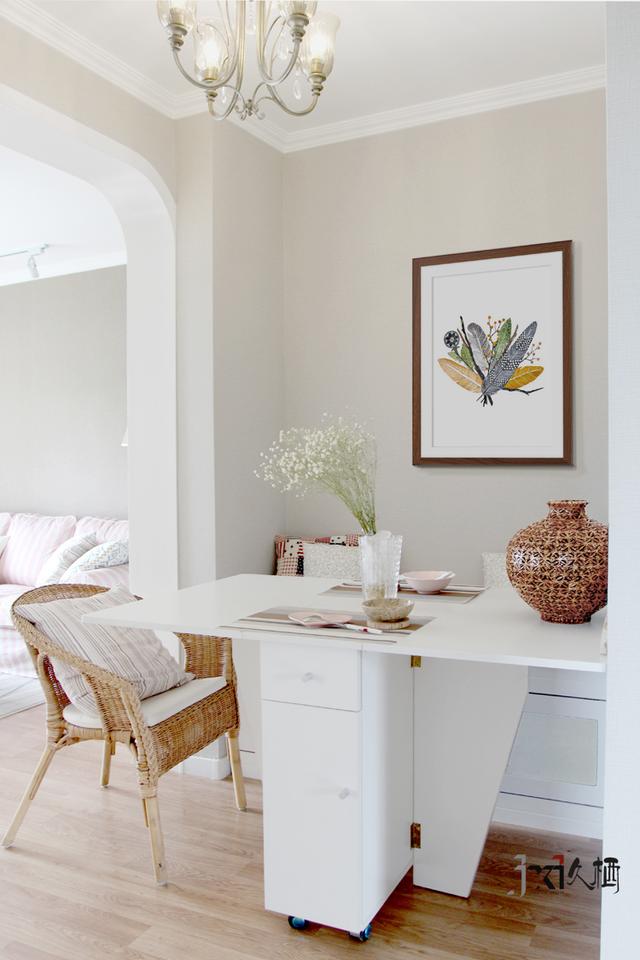 墙边做了很多柜子,而转角处则成了餐厅。重要是面积不大,户型不够周正。