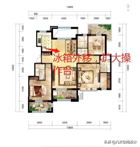 1.没有办法改变厨房位置,如果合适,可以把冰箱放在餐厅,增加厨房餐桌的操作空间;