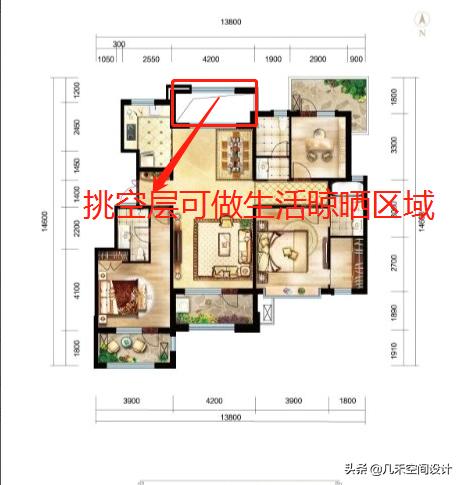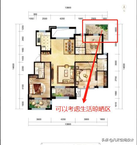 3.如果餐厅外的空层不能使用,那么就有两个地方考虑生活晾晒区;一个是客厅外的休闲阳台,另一个是次卧外的露台;个人建议生活晾晒区设计在露台是很好的选择;