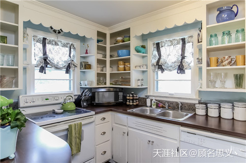 从图中可看出,虽说烹调区中的物品较多,不外整齐的放置却让人觉得非常温馨,亮白色的柜面搭上棕色的台面,条理感十足,别的为了增加空气的畅通度及厨房中的亮度,设置了两扇窗户,配上田园风的窗帘,让人表情变得异常轻松简约拆修效果图。