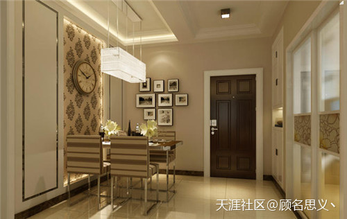 饭厅和烹调区是设置在统一区域的,只是运用了玻璃门停止分隔,使得各块区域的功用化愈加明白,长方体的吊灯悬挂在餐桌上方,显得非常美妙,别的为了使得那块区域更有特色,在墙面上设想了照片墙的粉饰,非常吸睛简约拆修效果图。