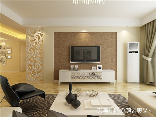 因为室第的规格较狭小,所以在大厅中放置的物品也不多,只是简单的放了一套沙发和电视柜,典范的黑白色彼此搭配,使得整体看上去不会那么沉闷,别的棕色的电视布景墙在射灯的照射下,显得别有一番风味,搭上白色的镂空隔绝距离屏风,更有神韵简约拆修效果图。
