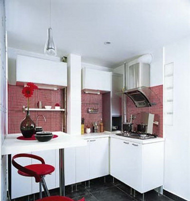的白色桌板,两旁摆放的红色吧凳,立即划分出快速便当的用餐区复古气概拆修效果图。