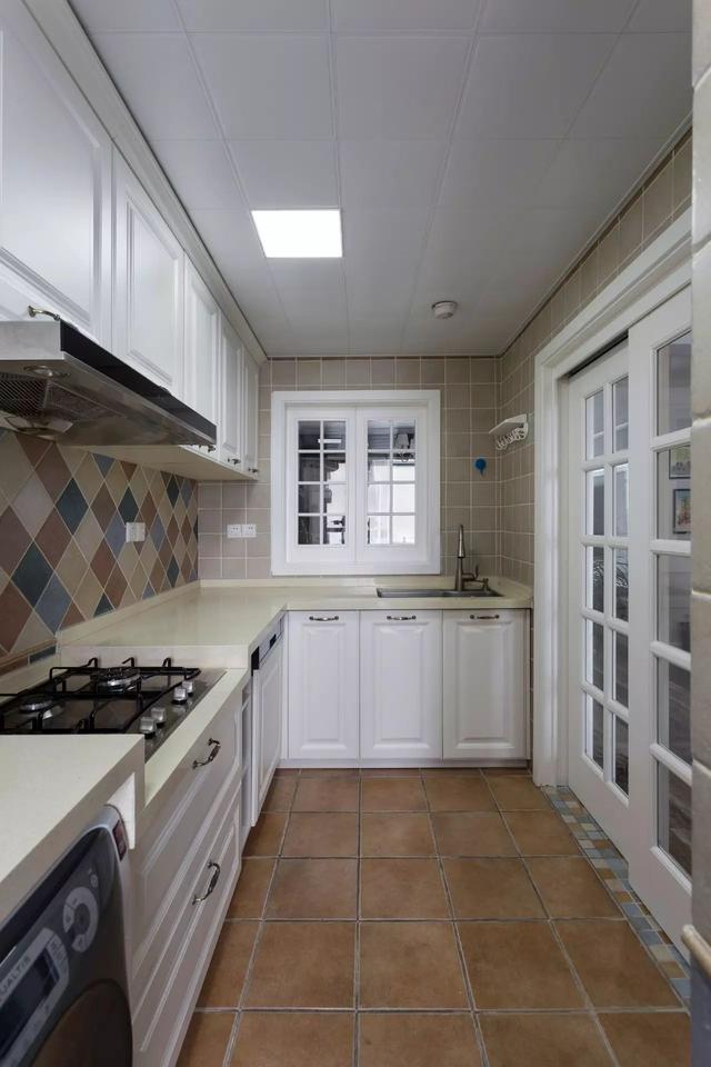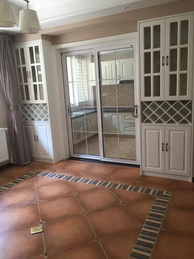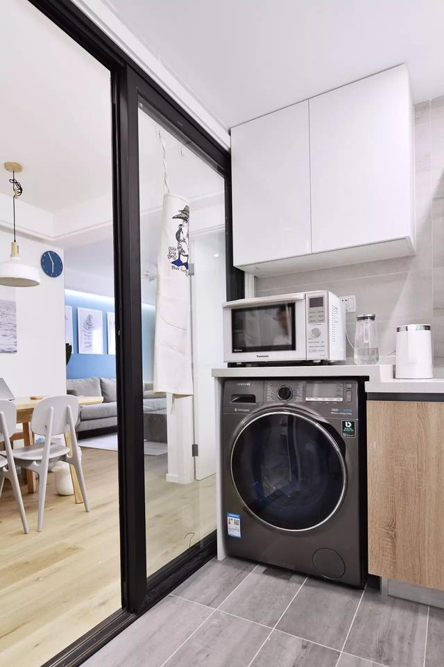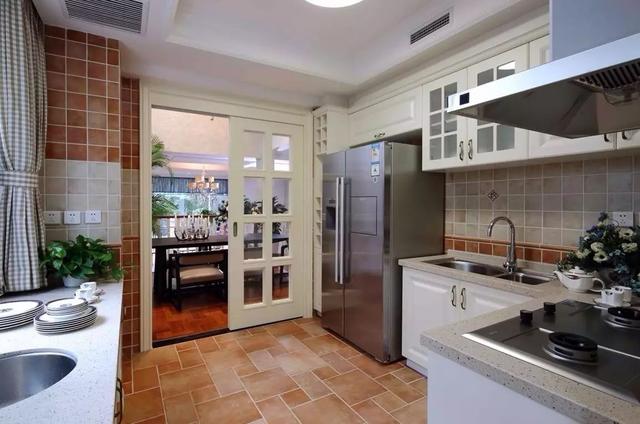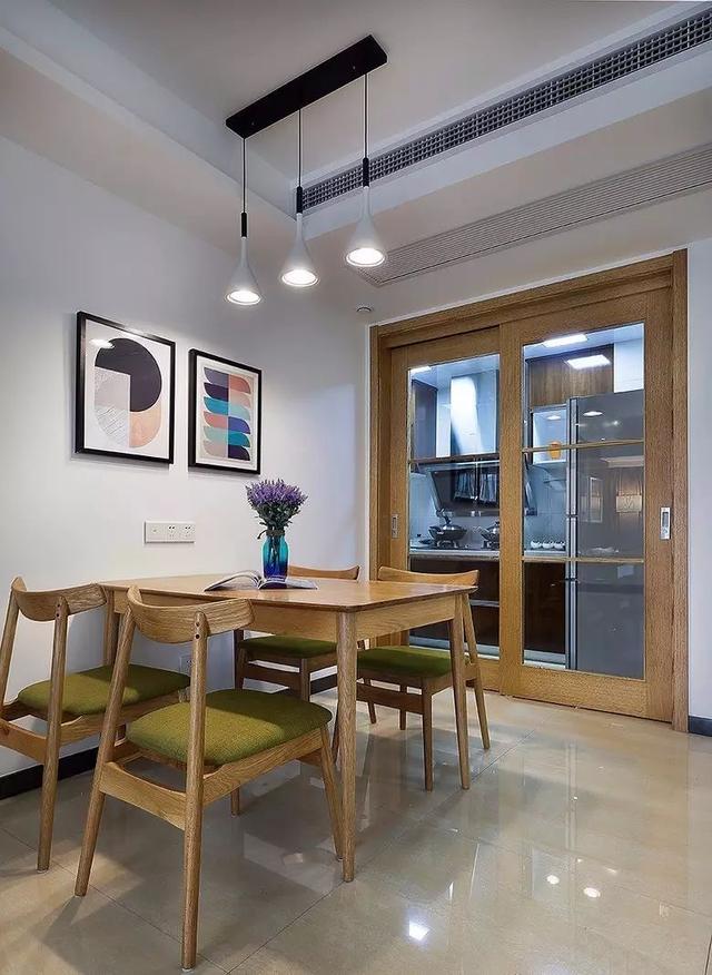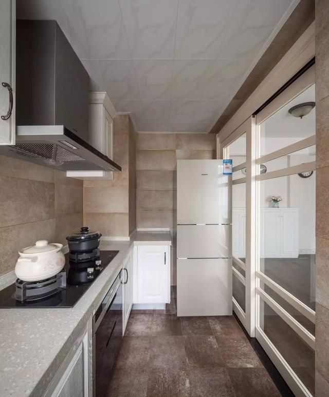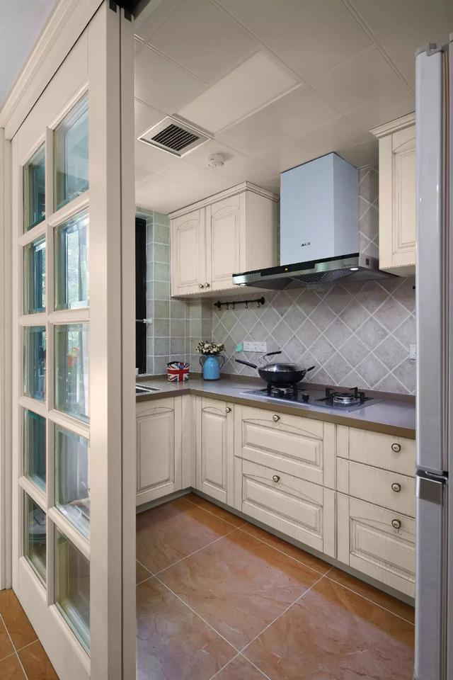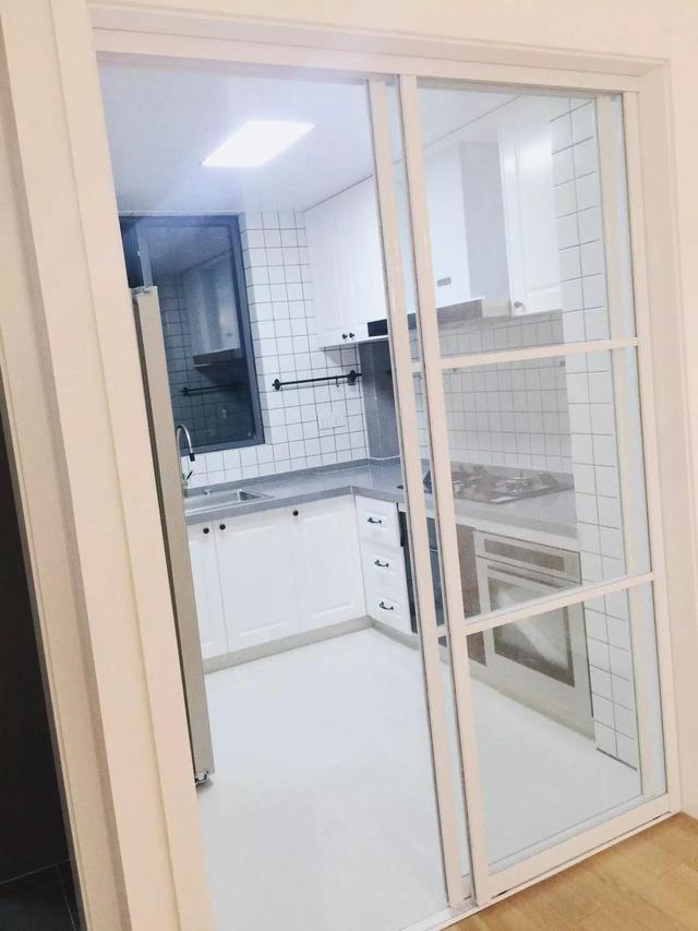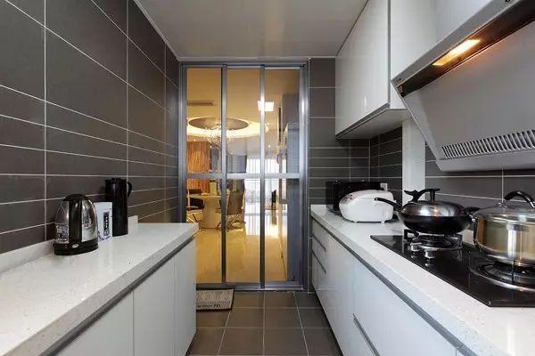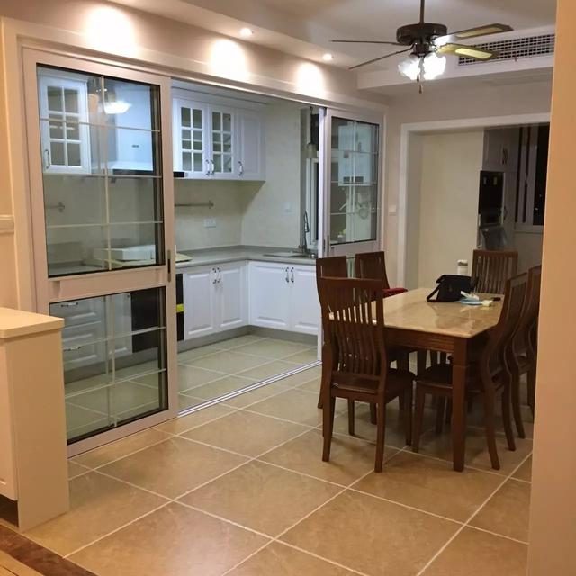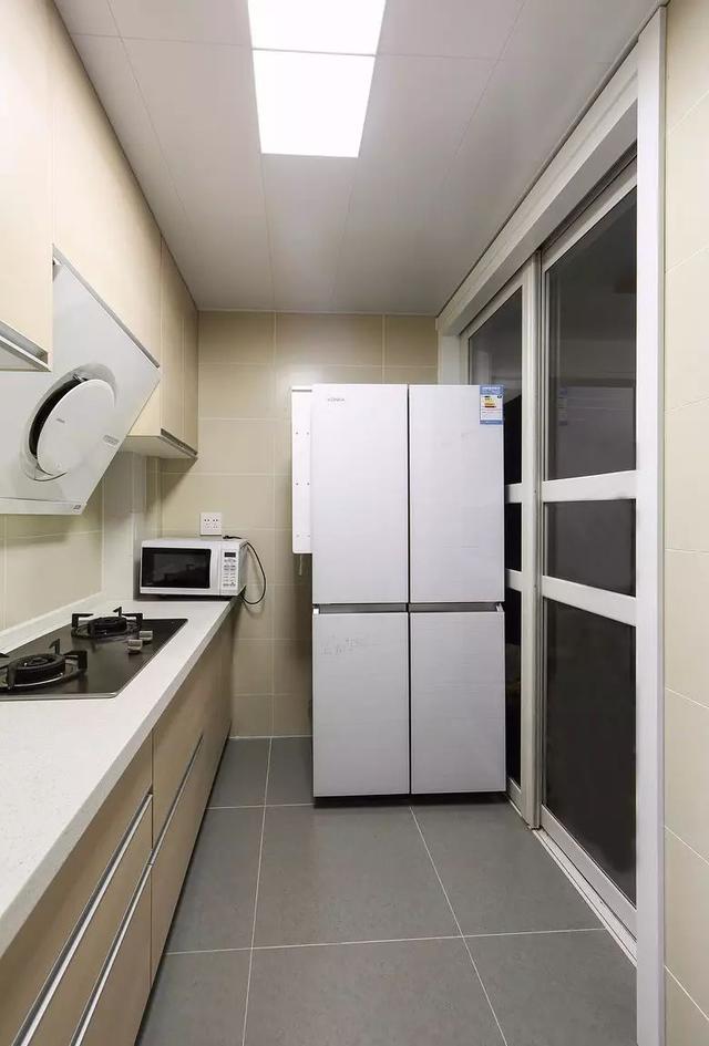 25、厨房与餐厅的地砖颜色连结一致厨房门拆修效果图,在翻开厨房推拉门后,整个空间都觉得好宽阔大方;
