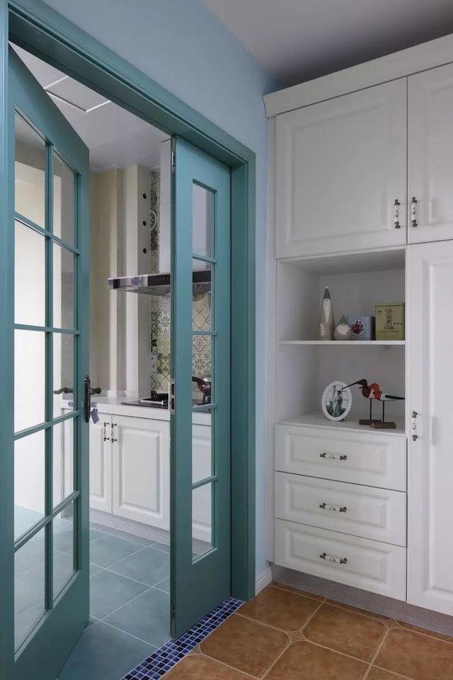 38、蓝色的厨房门厨房门拆修效果图,与复古的地砖连系,效果显得稳重恬静又高档;