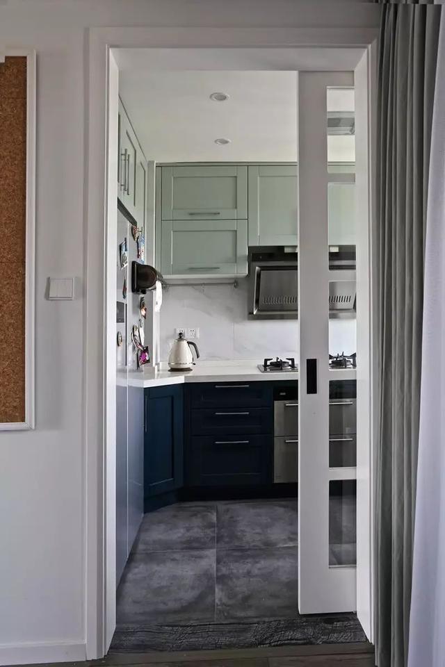 37、孔雀蓝色的厨房门厨房门拆修效果图,搭配厨房里面的花砖,整体效果复古情调又年轻;
