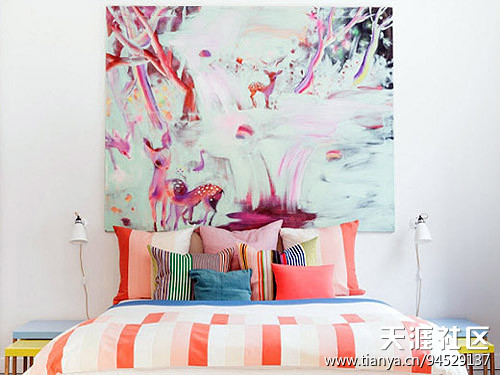 那款以彩虹为主题的卧室设想最合女生口味,欢乐的色彩让卧室生活的情感也跟着高涨,绿色的卧室布景墙带有春天的气息,也给卧室付与了活力,彩色的床品与之协调搭配,衬托出天然浪漫的小情怀卧室设想效果图。